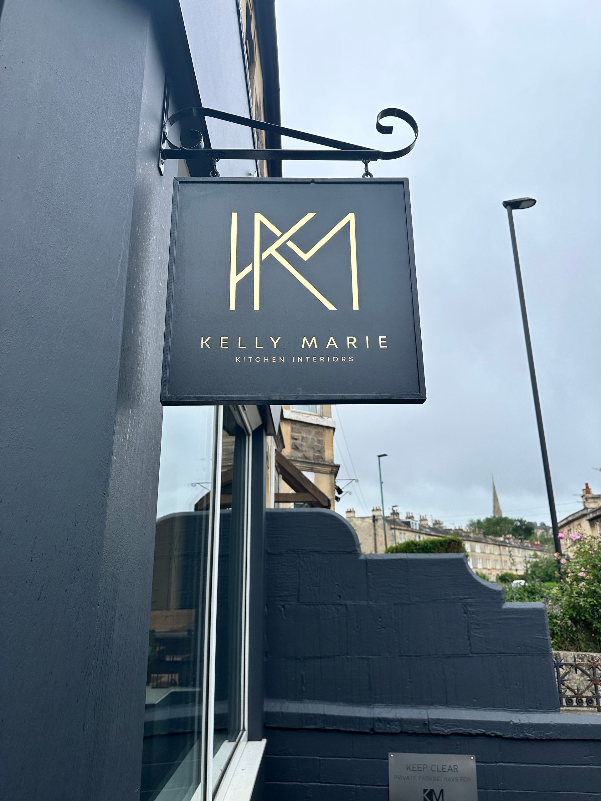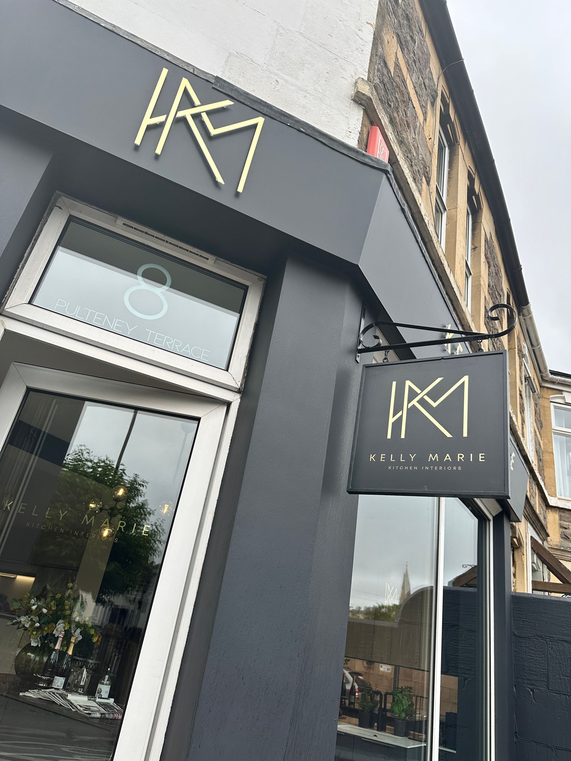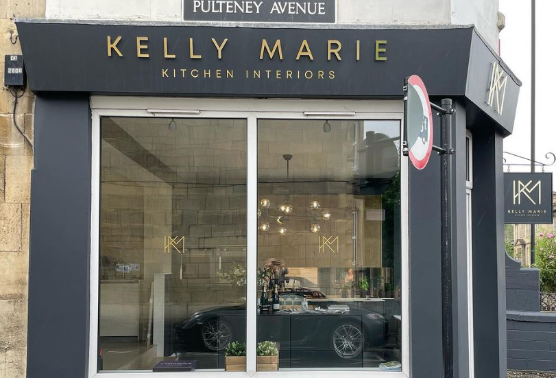 Farrow and Ball colour. Adding a touch of elegance, we applied gold vinyl lettering and stand-off acrylic lettering with a gold vinyl finish. The result is a captivating shopfront that truly captures the essence of Kelly Marie Kitchen Interiors.
