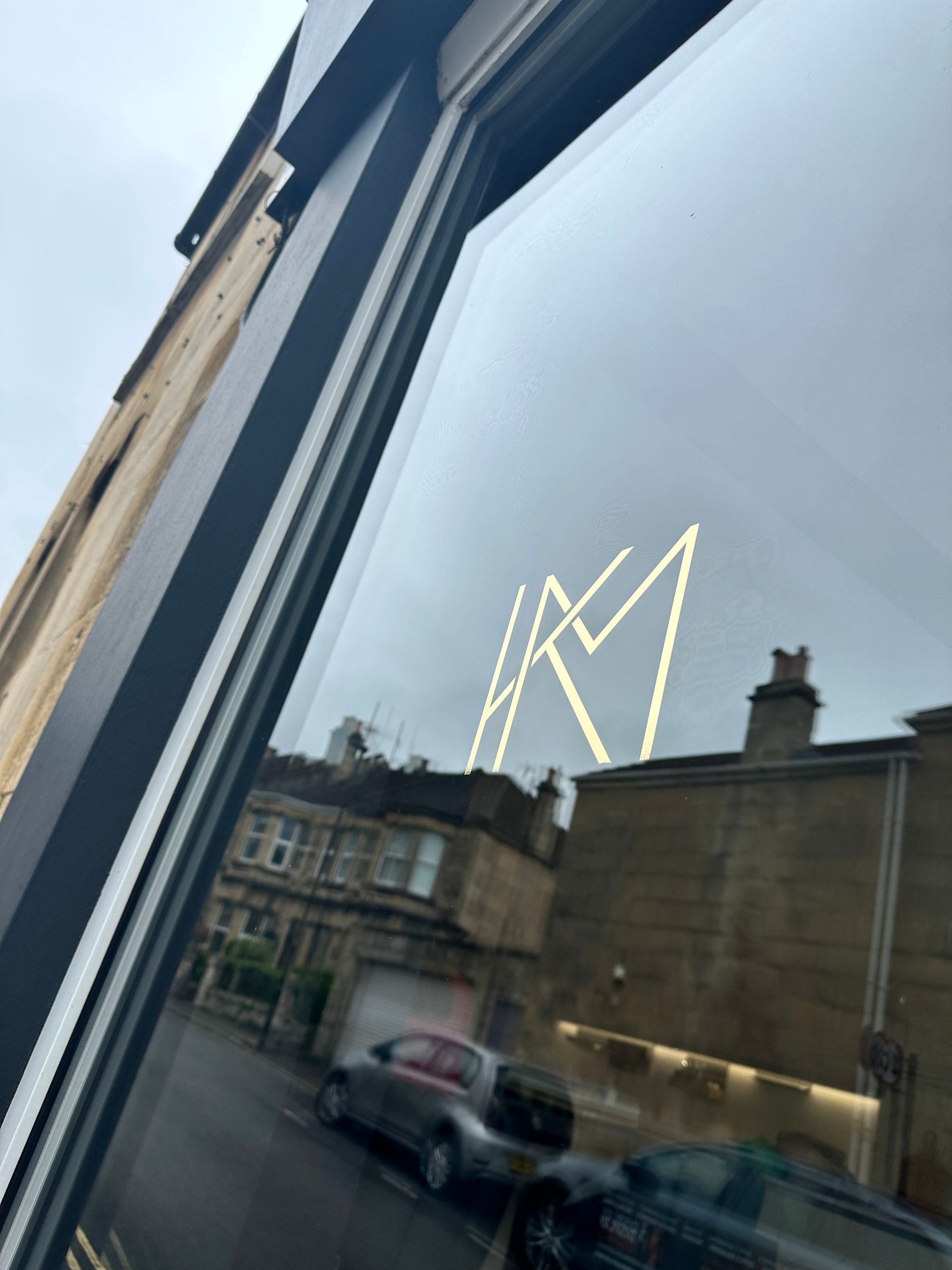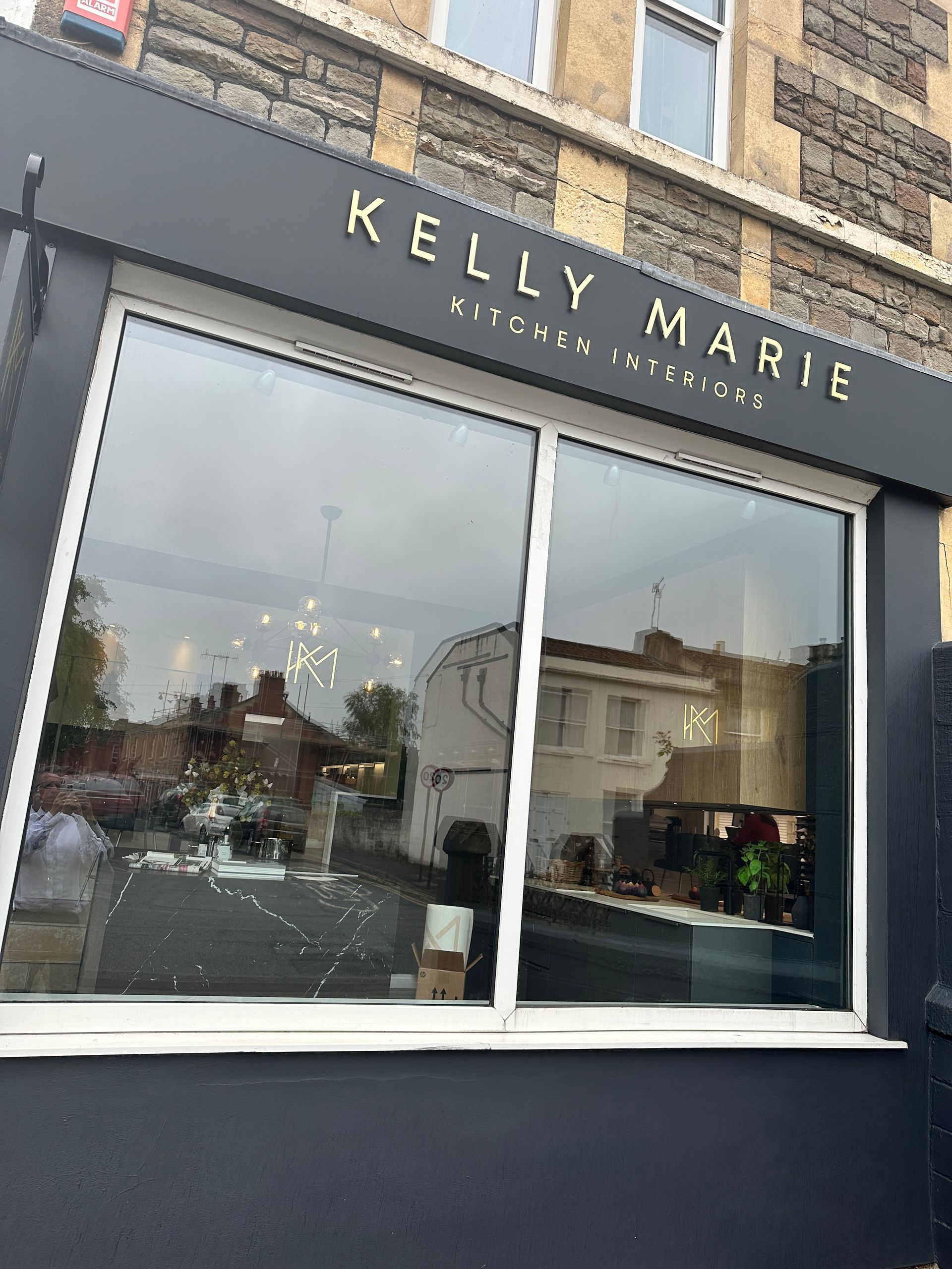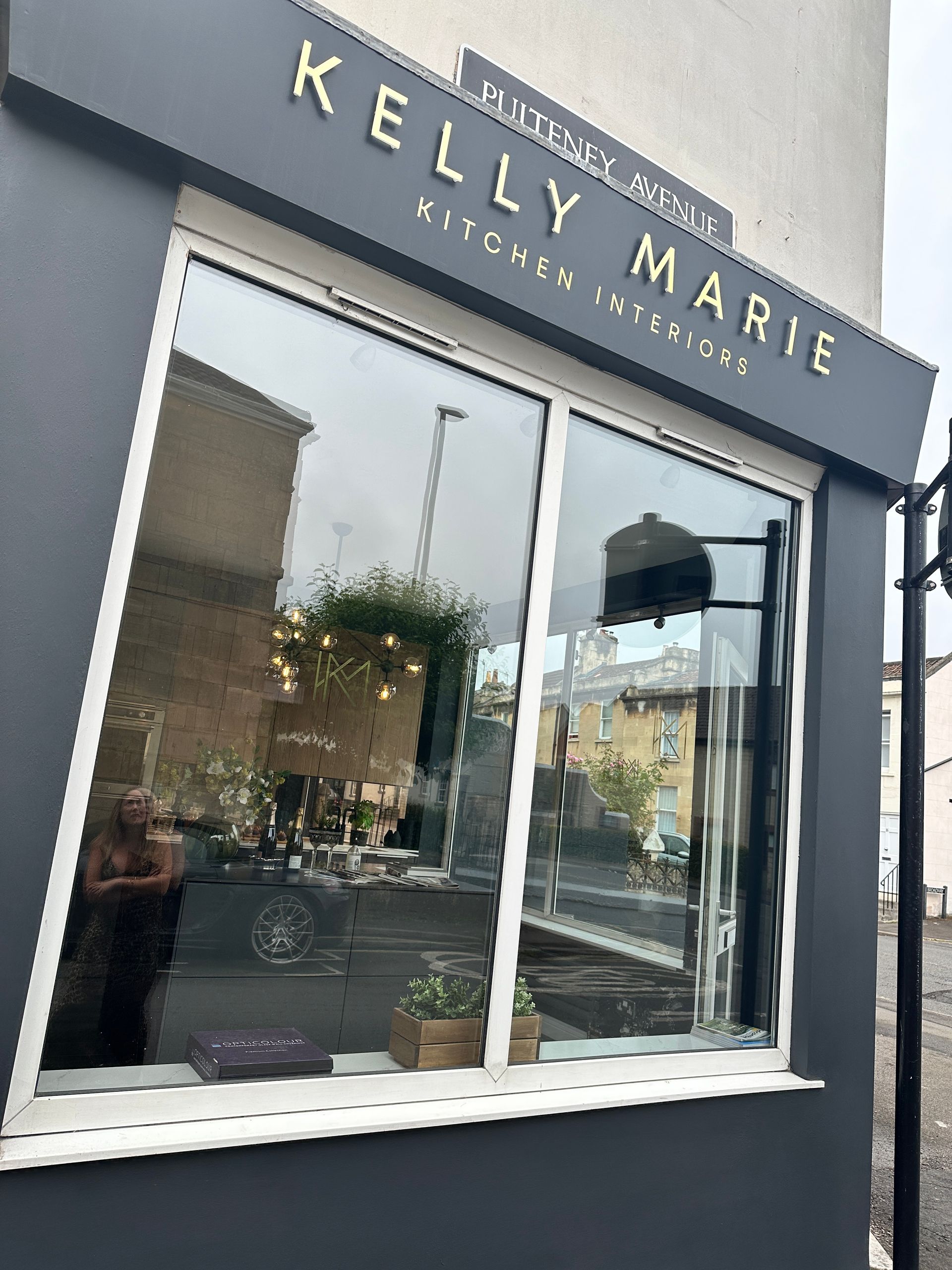 Farrow and Ball colour. Adding a touch of elegance, we applied gold vinyl lettering and stand-off acrylic lettering with a gold vinyl finish. The result is a captivating shopfront that truly captures the essence of Kelly Marie Kitchen Interiors.